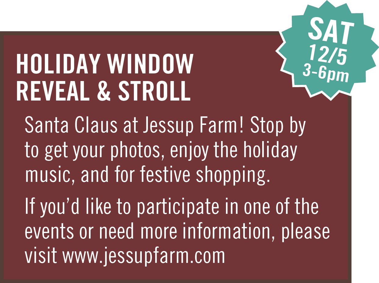 Kick off the holiday season at Jessup Farm during the Holiday Window Reveal & Stroll on Saturday, December 5 from 3–6pm. The village will come alive with festive window displays, holiday music, and seasonal cheer.