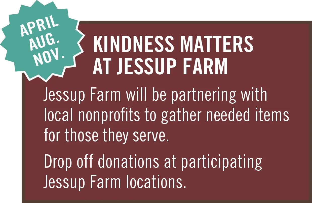 Throughout the year, Jessup Farm partners with local nonprofits to support important causes in our community. During select months, visitors are invited to bring needed donation items to participating Jessup Farm businesses to help support organizations serving Northern Colorado.