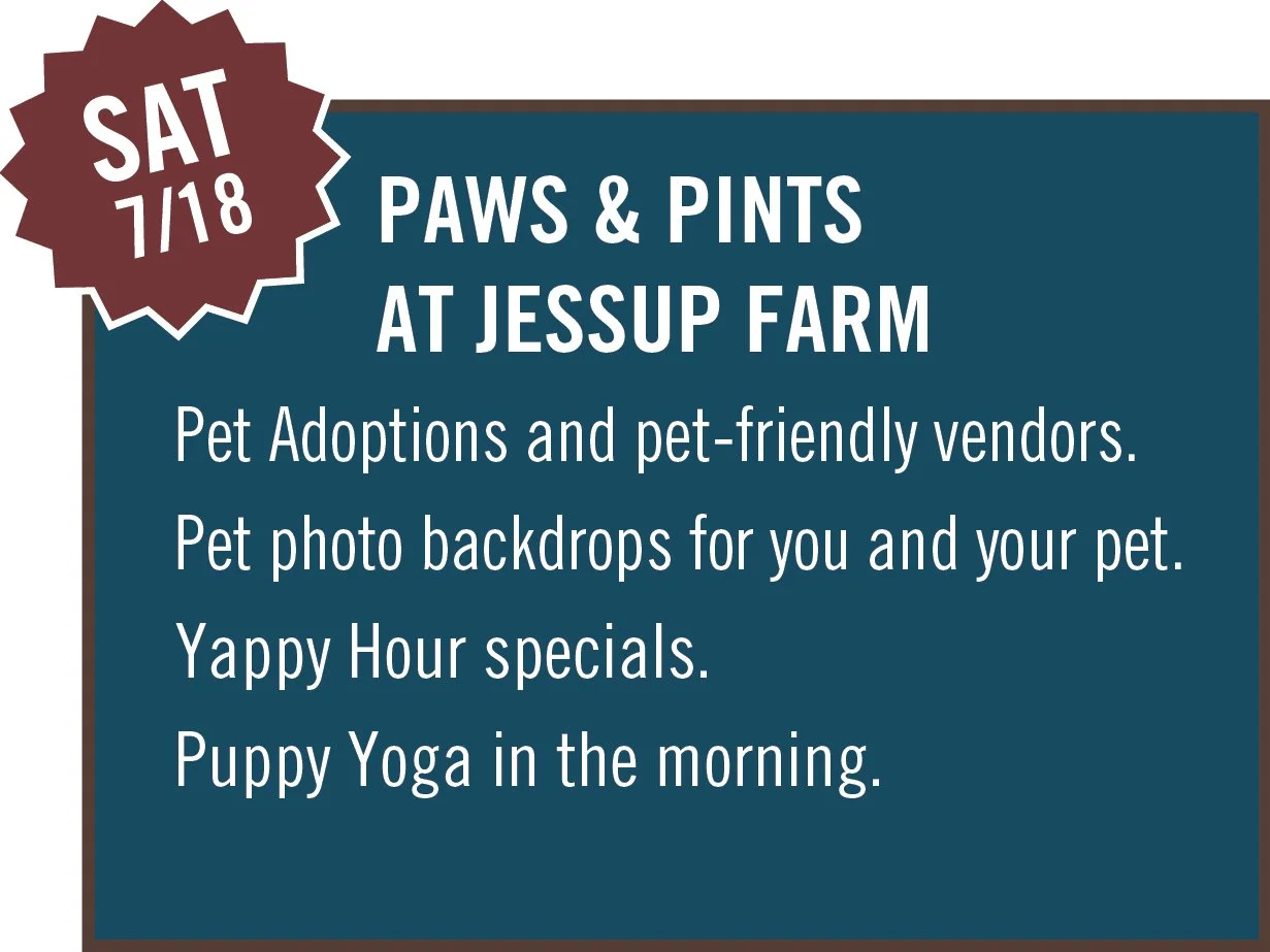 Start the morning with puppy yoga, then stick around for Yappy Hour specials and time to explore the village. Whether you're looking to adopt, shop for your pet, or just enjoy a day out with your dog, Paws & Pints is a tail-wagging good time at Jessup Farm.